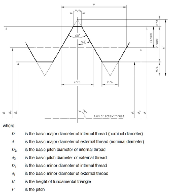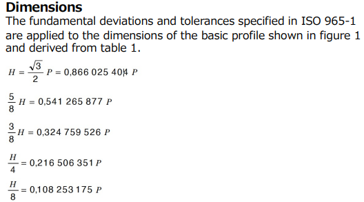 ISOのネジ山の標準規格では、標準のネジ山の図面のカタログではなく、形態を特徴づける寸法の定義とその寸法間の関係を関係式として規定したうえで、具体的な標準寸法の一覧表を規定するという形で標準仕様を規定しています。